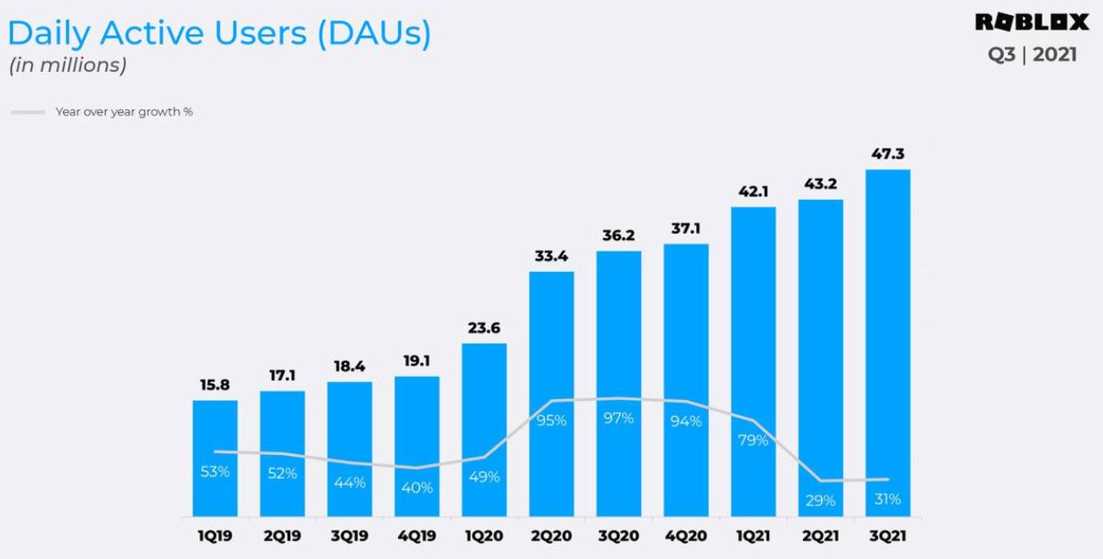 So they're off by a factor of 7 here and this isn't even close to the most egregious error. MMO-Population.com puts Roblox at 229K active players today which is hilariously inaccurate. Roblox should take the #1 spot on this list by a mile. Roblox is a publicly traded company that reports daily active users every quarter with their Q3 2021 daily active users clocking in at 47.3 million. This means MMO-Population's active playerbase number is off by over 200x.