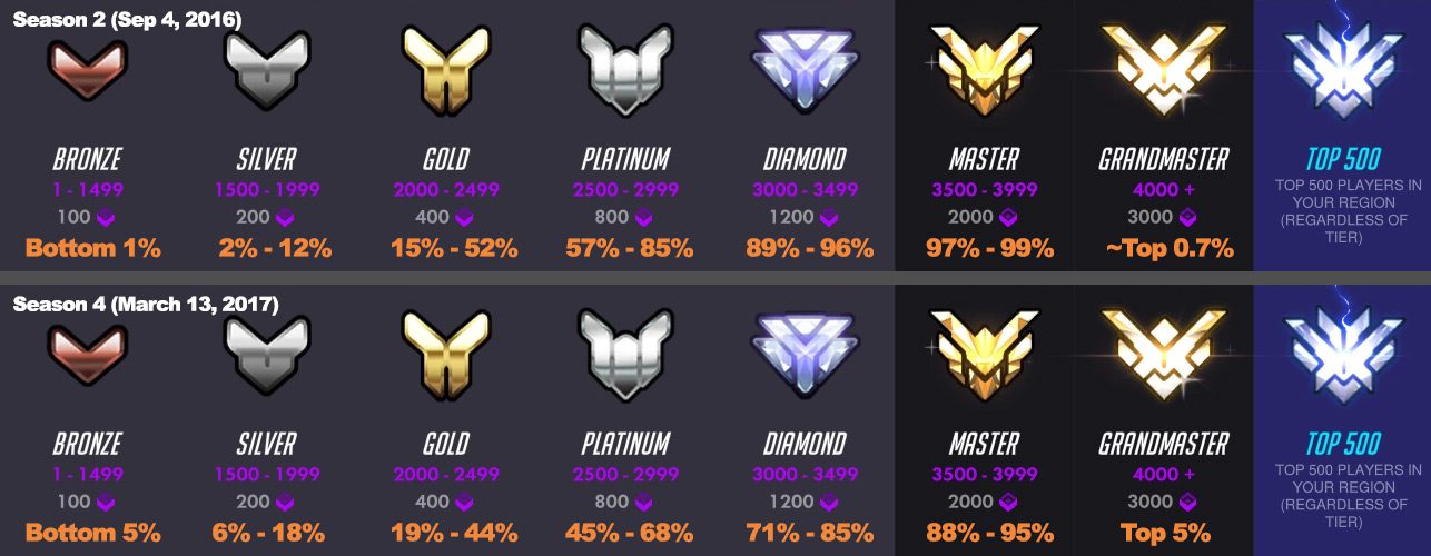 Edit: Scott Mercer posted on the Overwatch Competitive Forum on Battle.net showing completely different Season 3/4 statistics than the ones sourced from Masteroverwatch. The stats he posted shows Bronze 6%, Silver 22%, Gold 34%, Platinum 23%, Diamond 10%, Master 3%, and Grandmaster less than 1%. These are stats for peak rank achieved. The SR inflation between S2 and S3/S4 remains indisputable as SR of 3,844 was enough to put someone in the top 50 worldwide season 2 while rank 50 in S4 is ~4600. Given that "gold" is awarded to those even at the bottom 29th percentile continues to validate my belief that Overwatch coddles its playerbase.