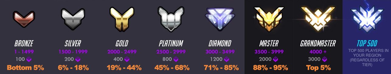 While a Gold medal in the Olympics is a matter of national pride, a gold medal in Overwatch isn't much more than a participation award. The currently breakdown of competitive tiers are a mockery of the term 'competitive'. We truly live in an upside down world when someone in the bottom 19th percentile places in "Gold".