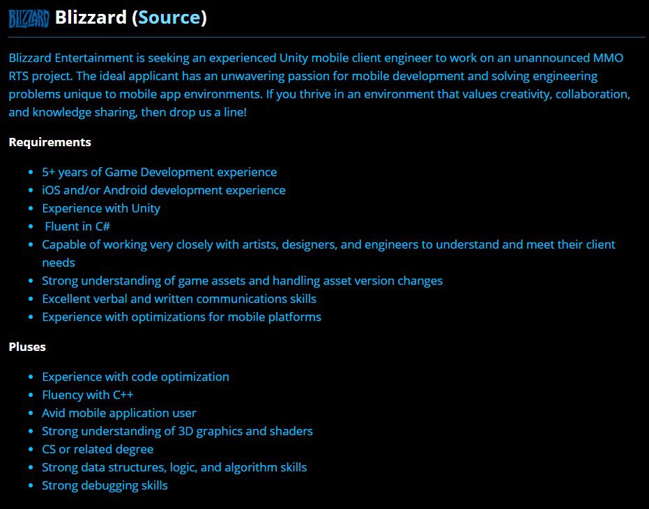 Blizzard Entertainment posted a job opening on their website for a mobile game developer proficient with Unity to help develop an unannounced mobile MMORTS. Beyond the actual job listing, there's been no official announcement. Check out the actual job listing (link 404s now, but we have it saved here):