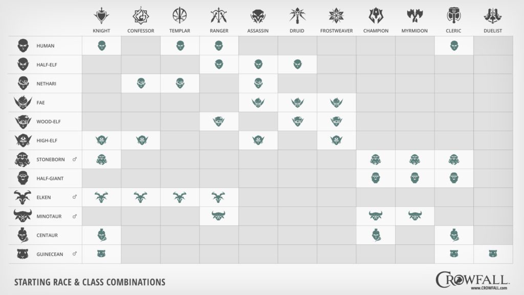 All amazing changes that should excite fans who have been following the Crowfall project since its inception in 2015. As the official post and accompanying videos describe, the new Race/Class system allows for far more character variety. The previous system locked players by archetype: if you wanted to play as an Assassin, you had to be a Fea. The new system is much more like that found in other MMORPGs, with a impressive total of 12 races and 11 classes as shown on the chart below: