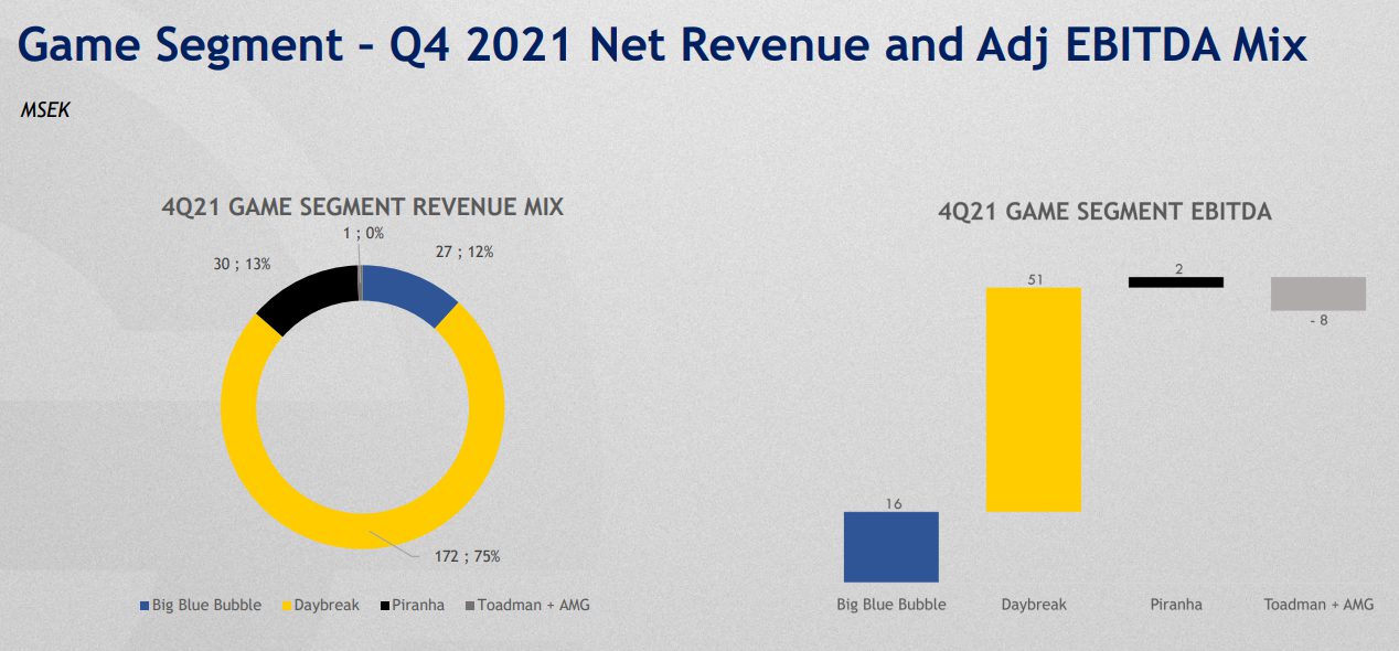 “Daybreak currently operates 8 live titles. For Q4 2021, Daybreak contributed net revenues and adjusted EBITDA of SEK 172.4 million and SEK 51.4 million, respectively. Daybreak provided the largest contribution amongst the group companies with a net revenue contribution of 30 percent and adjusted EBITDA contribution of 43 percent for the period. With the addition of Magic: The Gathering Online to its portfolio, Daybreak will demonstrate further growth in 2022.”