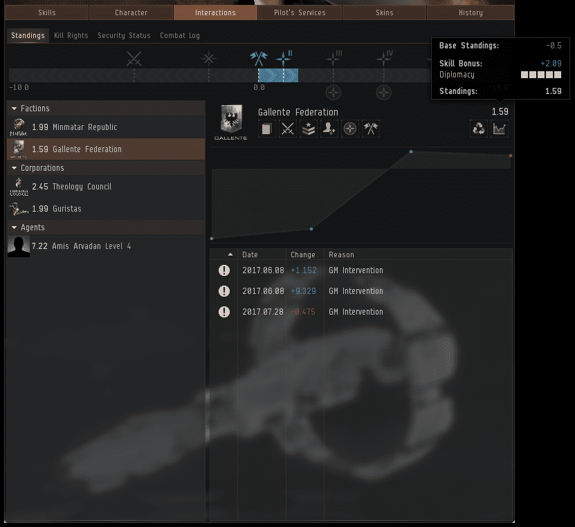 Introducing what is arguably the biggest part of this update, the new NPC Standings menu comes with certain key features that will help players keep track of certain values. At the top, a bar to represent current standings with a selected Faction, Corporation, or Agent. On the left is where players can find all of the NPC Factons, Corps, and Agents they have encountered. The right features standings history with the currently selected party. According to the EVE Online developers, this last feature is already in the game, but "takes about 6 clicks and 3 different windows to access."