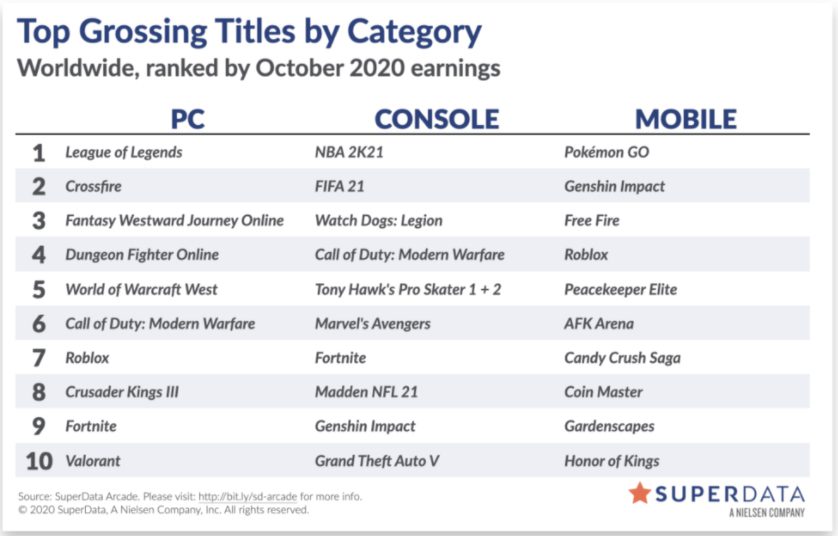 SuperData has just published their report on the highest grossing games for October 2020. According to the report, gamers spent $10.6 billion on digital games in October resulting in a 14% increase in game spending year-over-year.