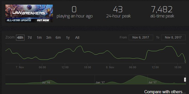 LawBreakers is holding another free weekend with hopes of increasing their declining playerbase and it couldn’t have come at a more opportune time. MMO Fallout recently captured a screenshot registering a current player count of “zero”. Now we’re not jumping to conclusions here, the servers might have been down during that time, but the game’s 24-hour peak of 43 players speaks for itself. The game is also at half-price until November 14th.