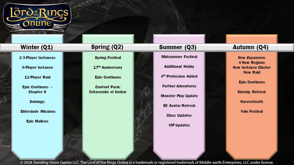 The first quarter of 2024 will bring the remaining Corsairs of Umbar instances and a 12-player raid that will mark the final content update for the expansion. Standing Stone will also be updating the Delving system with something called Epic Malices.