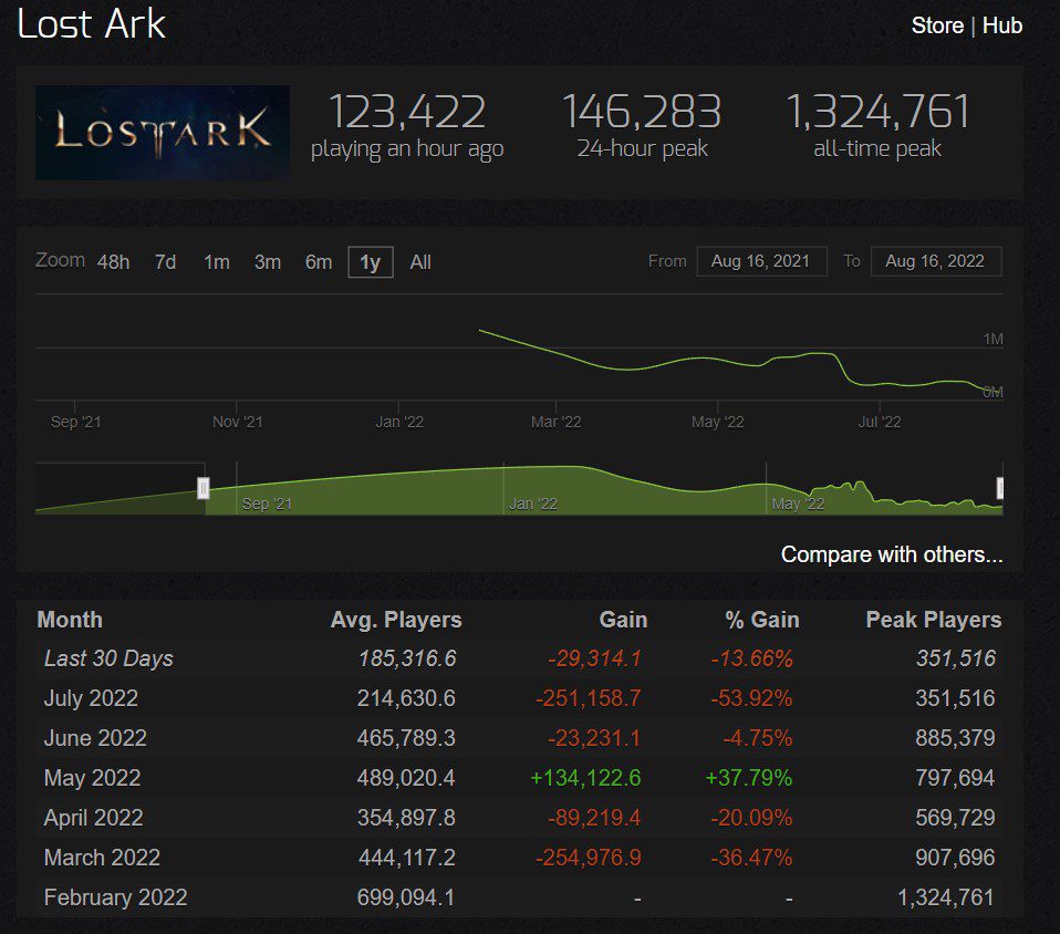 While Lost Ark's playerbase has fallen substantially since its launch, it still averages 185,000 concurrent players (over the last 30 days), making it one of the most popular MMORPGs out there. These numbers are dropping alarmingly fast though and with no sign of stopping. Still, if these numbers stabilize at around half of current levels, it would still be huge.