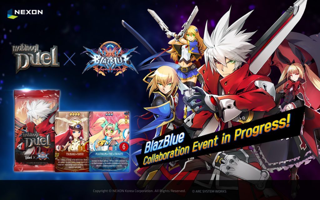 Nexon Korea announced today that a new BlazBlue crossover event has begun in Mabinogi Duel. The event introduces 24 new BlazBlue-themed cards, including "19 creature cards and five spell cards," as well as a new Competition Arena with rules that "[inhibit] spell usage" and new in-game challenges. The Competition Arena will be available until March 15th, whereas the in-game challenges will be available until March 14th. Both award "special tickets" and gems, but the Competition Arena will also award EXT cards.