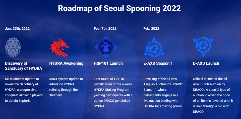 Mir 4, the first major 'play to earn' cryptocurrency powered MMORPG, announced 'Seoul Spooning 2022' which is a roadmap for the evolution of DRACO (Mir 4's play to earn crypto). The goal is to expand DRACO's used in the decentralized finance / game finance universe with additional features (like staking and a new token called HYDRA).