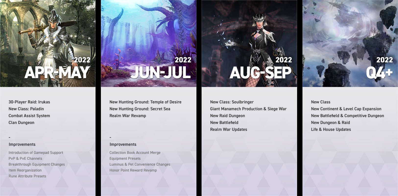 June to July will see the arrival of the Temple of Desire and Secret Sea Hunting Grounds, revamps to Realm Wars and Honor Point Rewards, and equipment presets, while August to September’s content release will feature another new class, the Soulbringer, the Giant Manamech Production and Siege War PvP encounters, a new raid dungeon, a new battlefield, and more updates to Realm Wars.