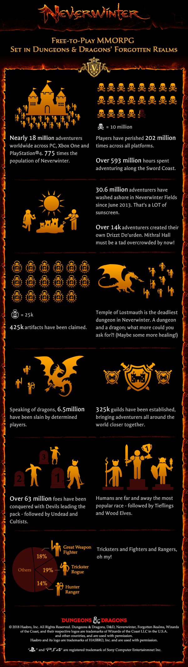 Neverwinter, the free to play action MMORPG from Cryptic Studios, celebrated it's 5th year anniversary this week (it launched on June 20th, 2013). Since launching, the game has been played by nearly 18 million players worldwide and throughout the years experienced 13 modules (updates). To celebrate the occasion, Cryptic Studios released the following infographic highlighting some interesting stats: