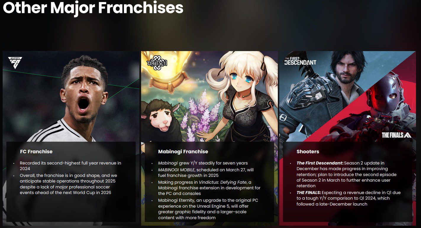 Nexon reported record annual revenue of ¥446.2 billion (~$3 billion) for 2024 thanks to the strong launch of Dungeon Fighter Online mobile (Dungeon&Fighter Mobile) in China. The global launch of The First Descendant was also cited as a driver of growth despite the game's average conccurrent playerbase dropping from ~200,000 at launch to around 9,000 today.