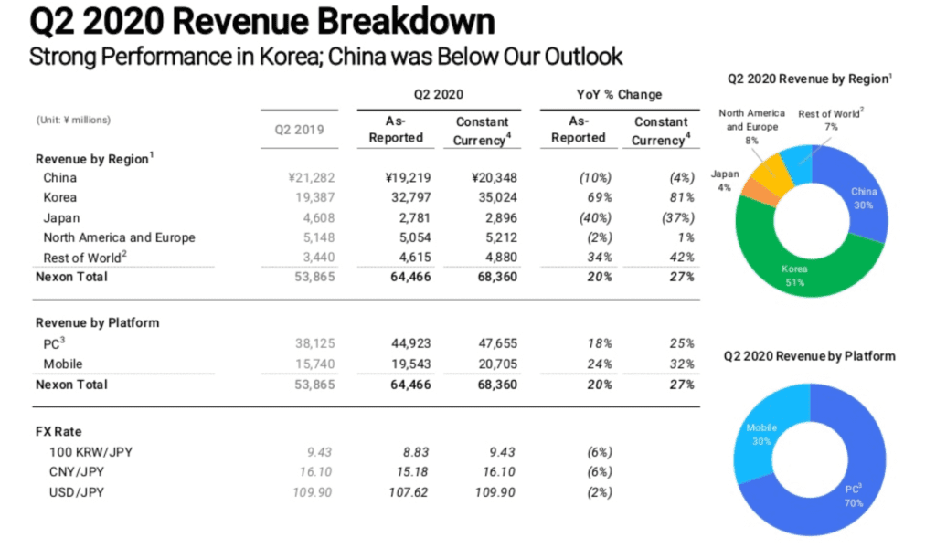 Nexon released their Q2 2020 earnings report yesterday with total revenues for the 2nd quarter (April - June) coming in at ~$609M. As with previous quarters, the vast majority of Nexon's revenue comes from PC games (70% PC and 30% mobile). South Korea and China remain the company's most lucrative markets with South Korea accounting for 51% of revenue and China 30%.