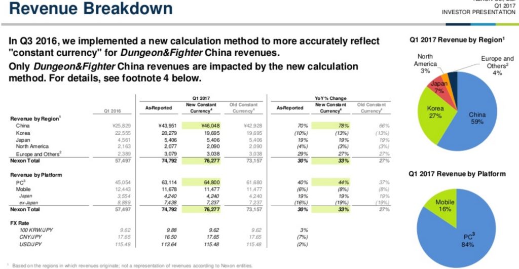 Nexon reported record revenues and profits today with the release of their Q1 2017 earnings report. Revenue is up a whopping 30% year over year thanks to the strong performance of Dungeon Fighter in China. While Netmarble and most other companies are growing rapidly in Mobile, Nexon still gets the bulk of their revenue growth from PC. PC Revenues grew 40% year over year while mobile revenues shrunk 6%.