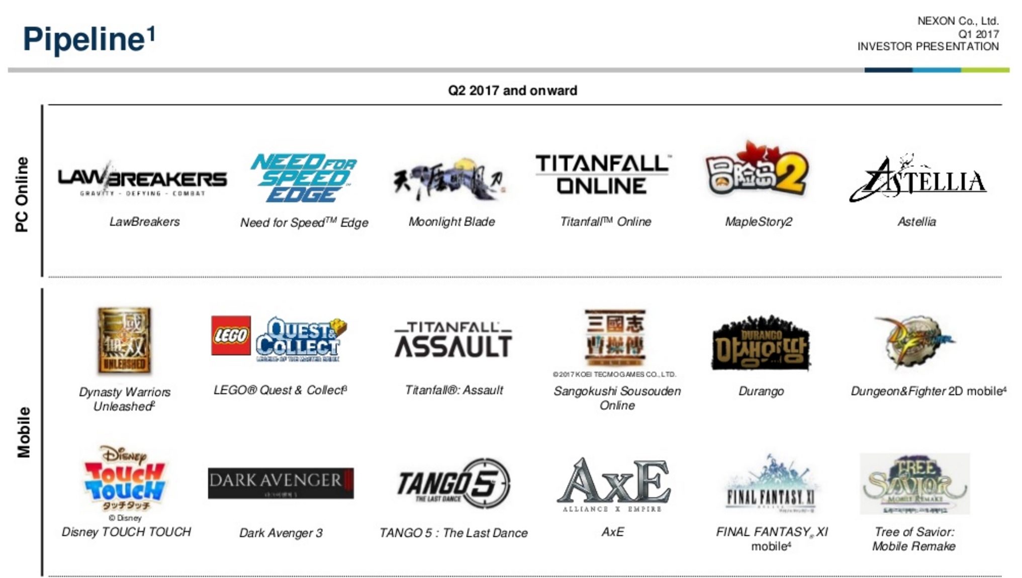 The company's stock price is also sitting at an all time high which reflects the strong operating performance of the company. Nexon's pipeline for 2017 and beyond currently looks like: