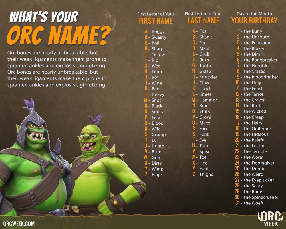 Also the the Orcs Must Die! Unchained Twitter account shared this brilliant image below. I got "Grump Funk The Hideous"—a name that verily only a mother could love.