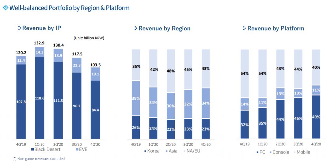 The report also reveals decreased revenue for both Black Desert Online and EVE Online during the past quarter with nearly 82% of total sales coming from the latter. Revenues also rose by 2% in Asia as PC revenues continue its upward trend over the past three quarters with a 3% increase quarter-over-quarter. Console revenues, however, are down by 4%.