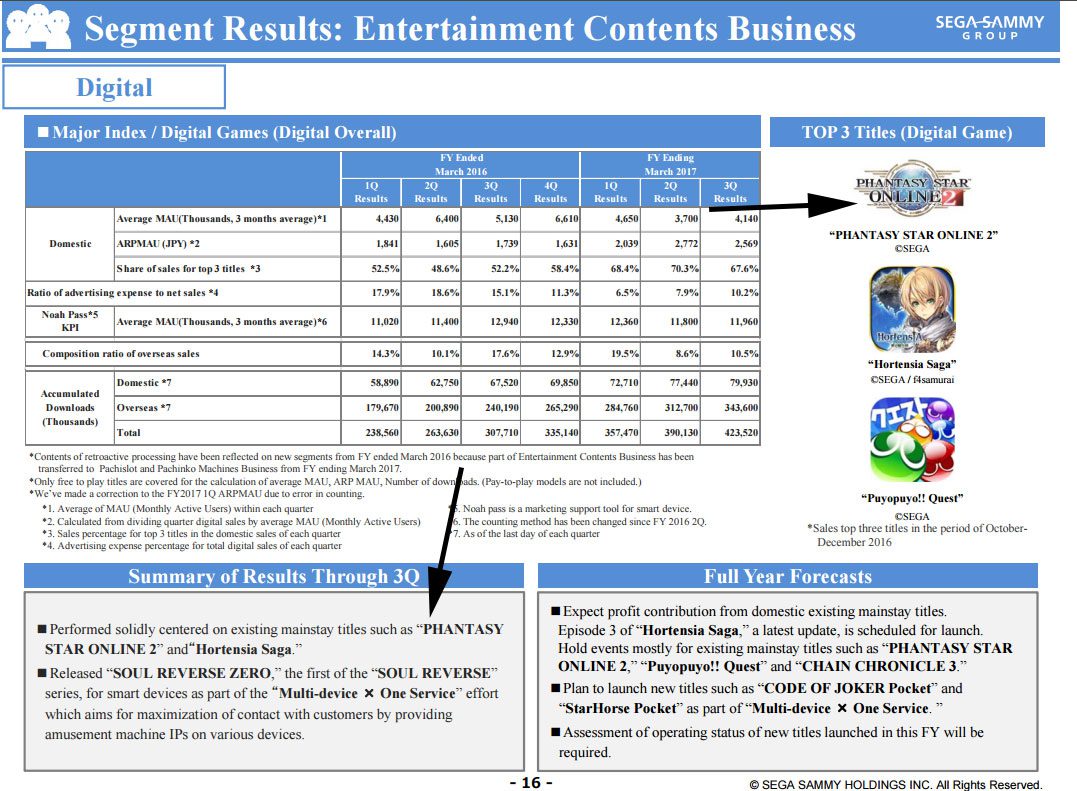Despite news of the Southeast Asian version of Phantasy Star Online 2 shutting down, the game still remains a huge moneymaker for Sega. In fact, Phantasy Star Online 2 makes so much money that Sega highlighted the game in their March FY 2017 earnings report which came out on February 2, 2017. Take a look below: