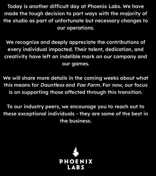 Phoenix Labs, the Vancouver BC based studio behind Dauntless and Fae Farm, has laid off a majority of its workforce, casting uncertainty over the future of both games. The studio announced the cuts in a LinkedIn post earlier today, calling the move “tough but necessary,” though it did not specify how many employees were affected or what the restructuring means for ongoing development. Updates on the games’ roadmaps are promised “in the coming weeks.”