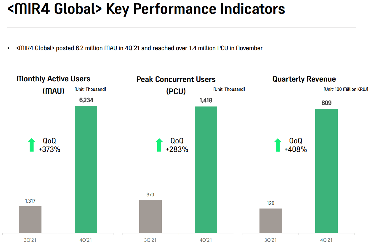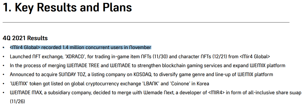 It may sound hard to believe, but the blockchain powered play to earn MMORPG Mir 4 hit 1.4 million concurrent users in November 2021 according to the company's latest earnings report published February 9, 2022. This 1.4 million figure is absolutely nuts. Just to put it into context, the most played game ever on Steam was PUBG which peaked at 3.2 million concurrent users in January 2018. #2 is Counter-Strike: Global Offensive which peaked at 1.3M concurrent users in April, 2020 (it peaks at under 1m lately).