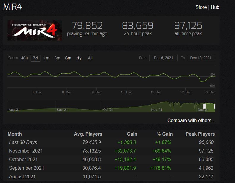 While I find the crypto and NFT concepts in Mir 4 interesting, the core gameplay is extremely lackluster. Mir 4 is a mobile game with a Steam version, but the gameplay looks and feels like any other generic auto-play MMORPG. It has lackluster graphics, generic artstyle, and uninspiring gameplay. Absolutely nothing special. Given the game's obvious flaws, it's amazing how much the crypto aspect of Mir 4 has carried it. 80,000 average concurrent players on Steam is extremely impressive. Most remarkable though is this figure is actually growing; the game's playerbase has increased every month since it launched in August, 2021.