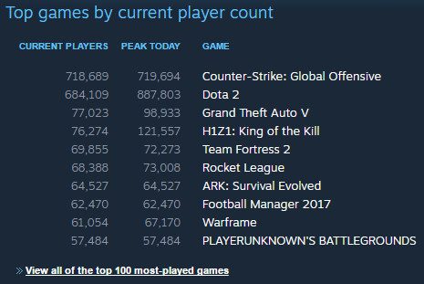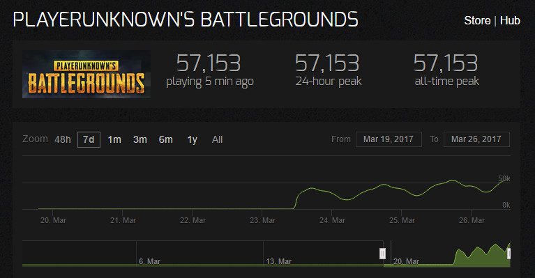 Are you one of the more than 57,000 people playing PLAYERUNKNOWN's Battlegrounds right now? Did you see this coming? Did it happen faster than you thought it would or slower than you thought it would? Do you think that it has a chance of dethroning H1Z1: King of the Kill, which, despite having a peak player count that is more than double its own, dropped to merely 20,000 players more than it at the time that it broke into the Top 10? Be sure to let us know in the comments!