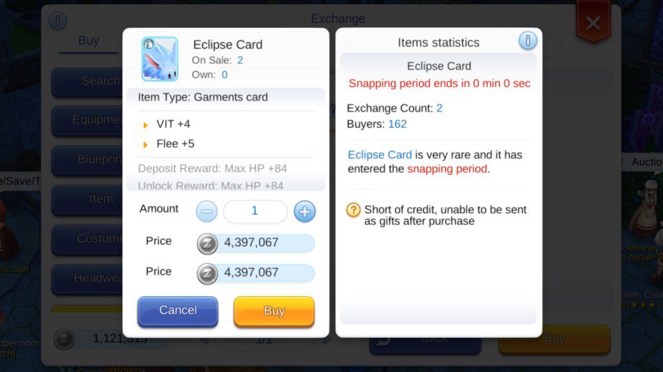 In the image above only 2 players out of the 162 buyers will win the Eclipse Card which is up for sale. Perhaps they went with this awkward system to encourage players to bid on rare cards through the premium currency auction house system instead, as it's the only way to easily snag these powerful cards.