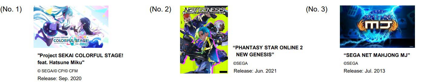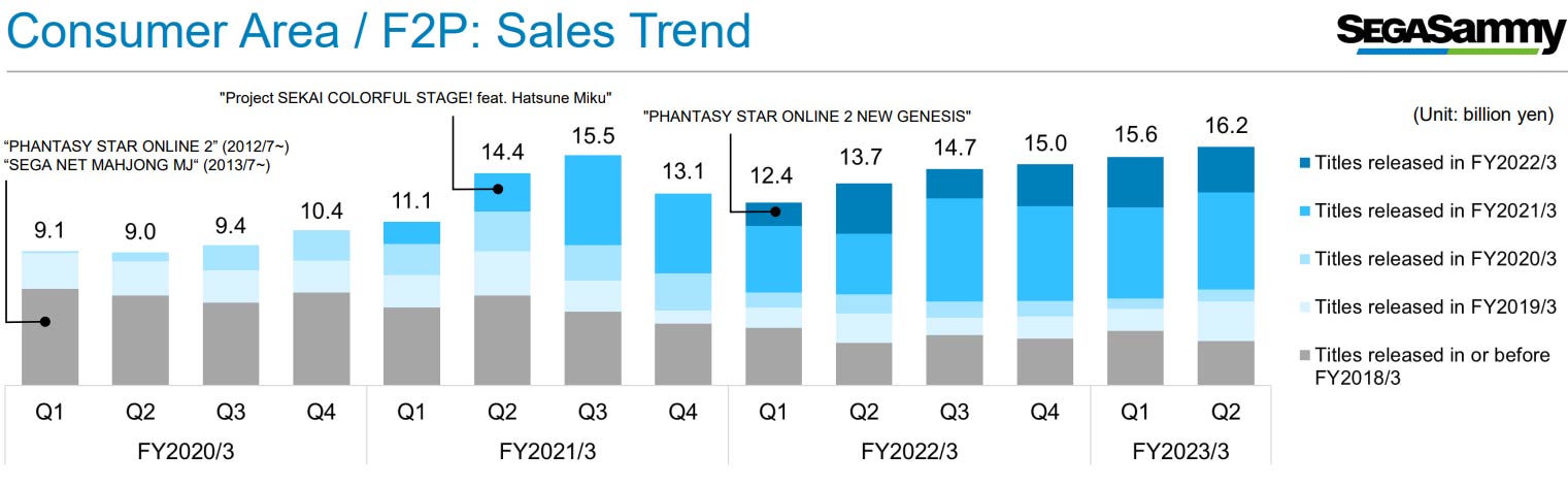 Sega Sammy reported their Q3 2022 earnings today and there were a few interesting tidbits of information. Firstly, the top 3 free to play games for the quarter were: "Project SEKAI COLORFUL STAGE! feat. Hatsune Miku", Phantasy Star Online 2, and Sega Net Mahjong MJ.