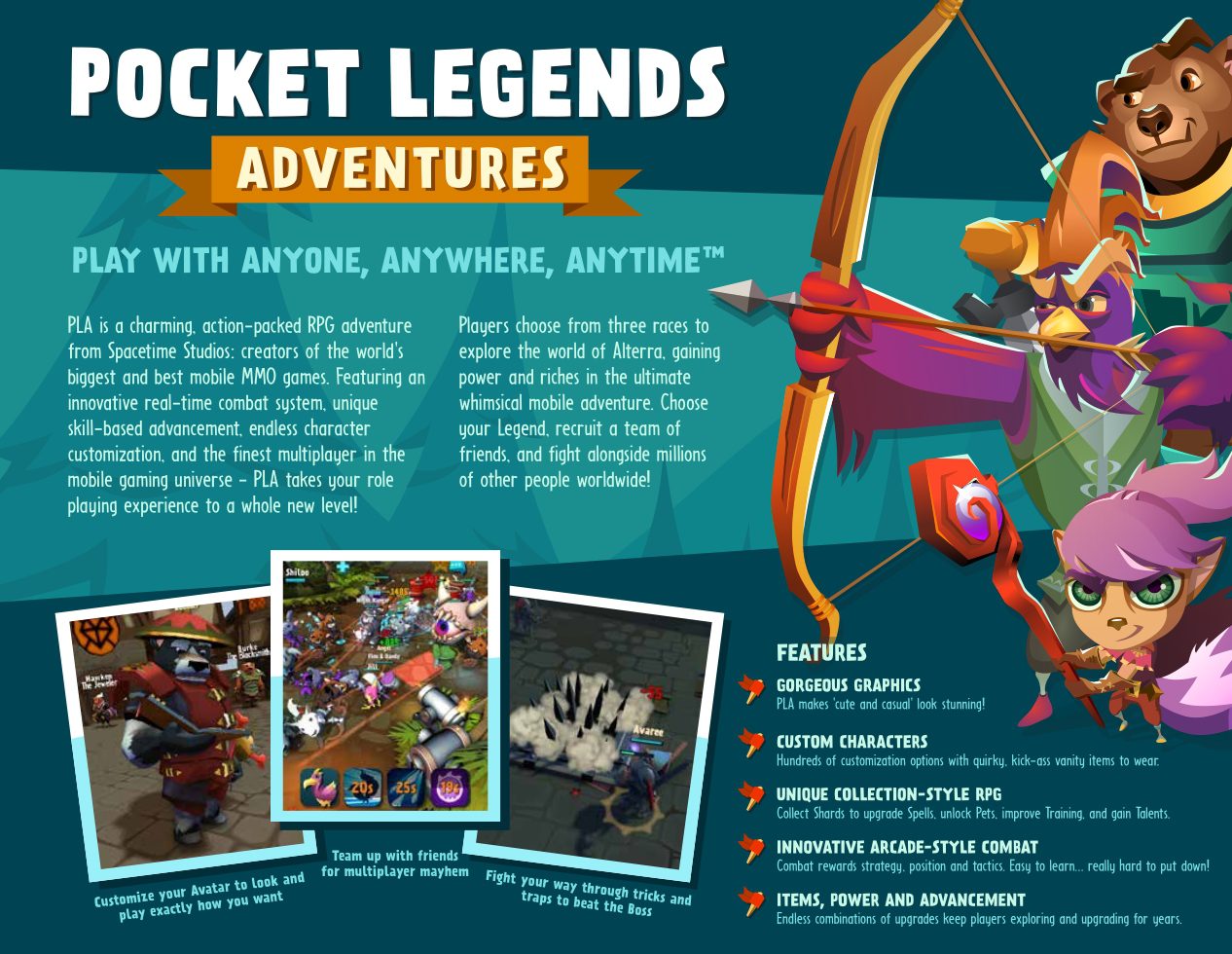 “Pocket Legends Adventures [is] an epic, action-packed multiplayer Role-Playing Game for iOS and Android platforms. Featuring innovative real-time combat, unique skills-based advancement, endless character customization, and extensive single player campaigns, Pocket Legends Adventures takes the mobile role-playing experience to a whole new level.”
