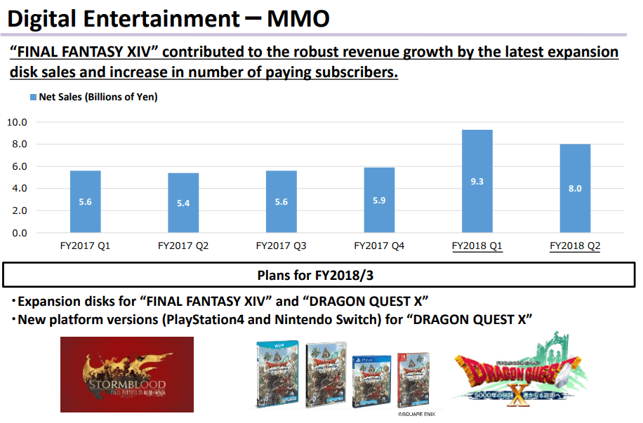 Square Enix reported strong quarterly earnings yesterday and attributed the quarter's success to the strong performance of Final Fantasy XIV: Stormblood and the continued success of their mobile games (Final Fantasy Brave Exvius, Kindom Hearts Union X, etc). Square Enix reported net sales of 1.165B USD during the last 6 months ended September, 2017 vs $938M for the 6 months ended September, 2016, an increase of 24.2% year over year. Here are some of the highlights from the earnings report: