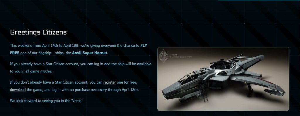 Starting April 14th and running until April 18th, players will be able to download the current client which clocks in at over 32 GB and take Star Citizen for a test drive. Free players will get to fly one of the game's flagship ships: The F7CM Anvil Super Hornet.