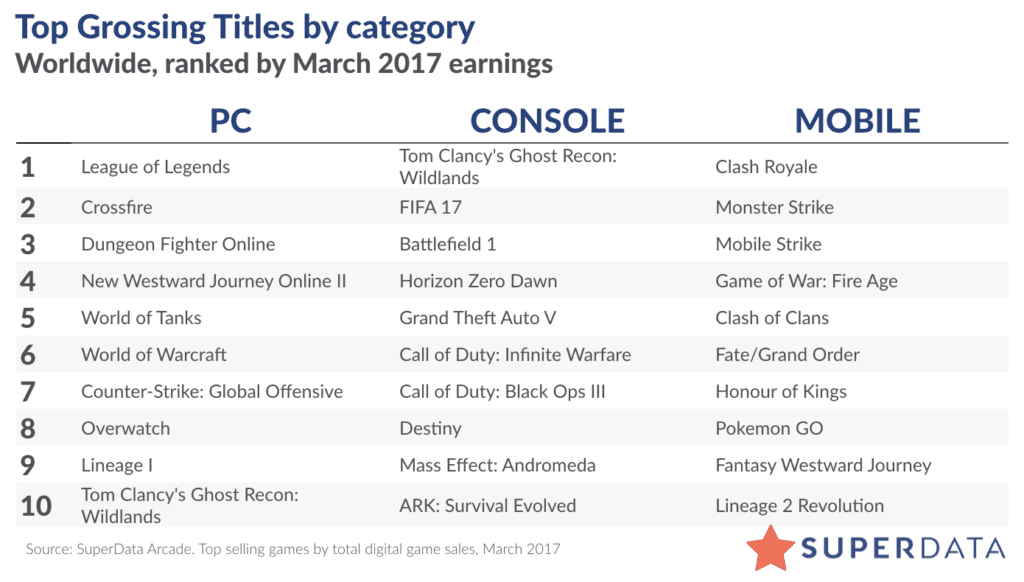 Many of the usual suspects topped the list once again this month including League of Legends for PC and Clash Royale for Mobile. Tom Clancy's Ghost Recon Wildlands was the best performing console game, and even its PC version managed to sneak into the top 10.