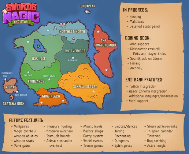 For Kickstarter backers, your exclusive pets and titles are next on the to-do list and will be coming soon to the game along with alchemy and fishing systems, and Mac support. Players can also look forward to Twitch integration, mod support, minigames, town quest boards, a party system, dungeons, world events, enchanting, monster taming, and more, all of which will be coming to the game at some unannounced date in the future.
