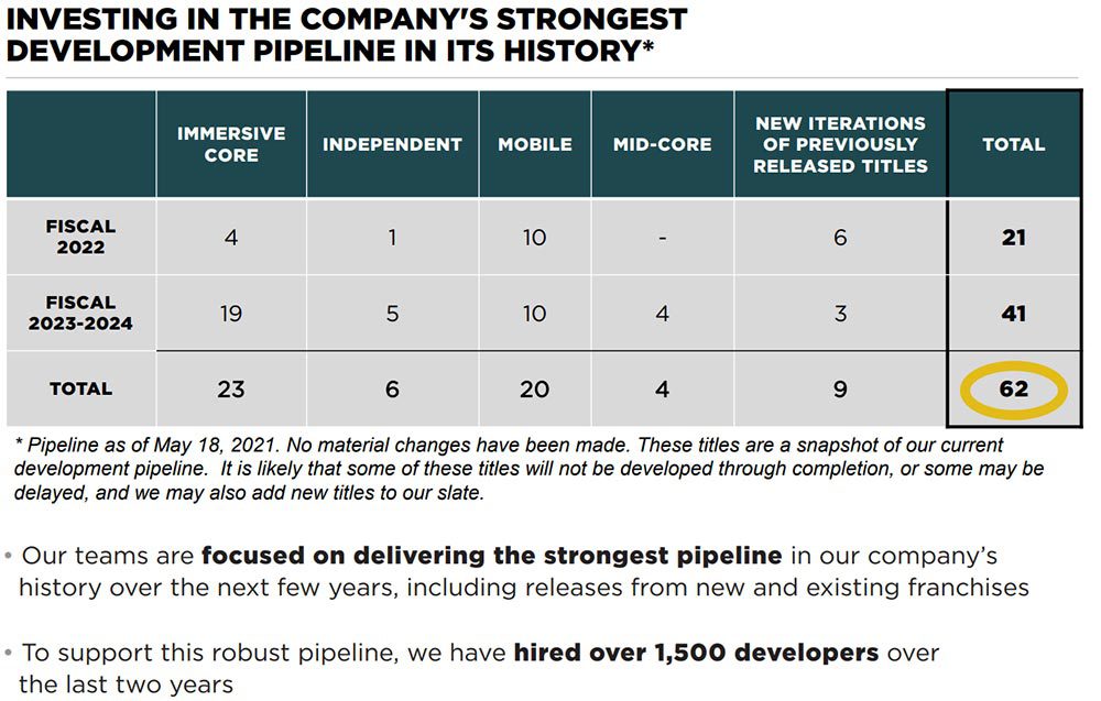 Take-Two is expanding aggressively though with 62 total games in the company's development pipeline (though Grand Theft Auto VI is by far the most important title in the works). The company has hired over 1,500 developer sin the last 2 years alone and currently employs over 5046 development studio staff.