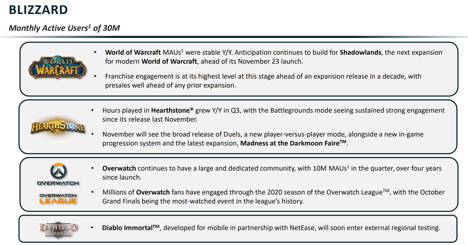 World of Warcraft continues to perform well during the Coronavirus pandemic, as more people are spending time at home playing video games. Activision Blizzard reported that World of Warcraft's engagement is at its highlest level at this stage head of an expansion release in a decade, with presales "well ahead of any prior expansion".